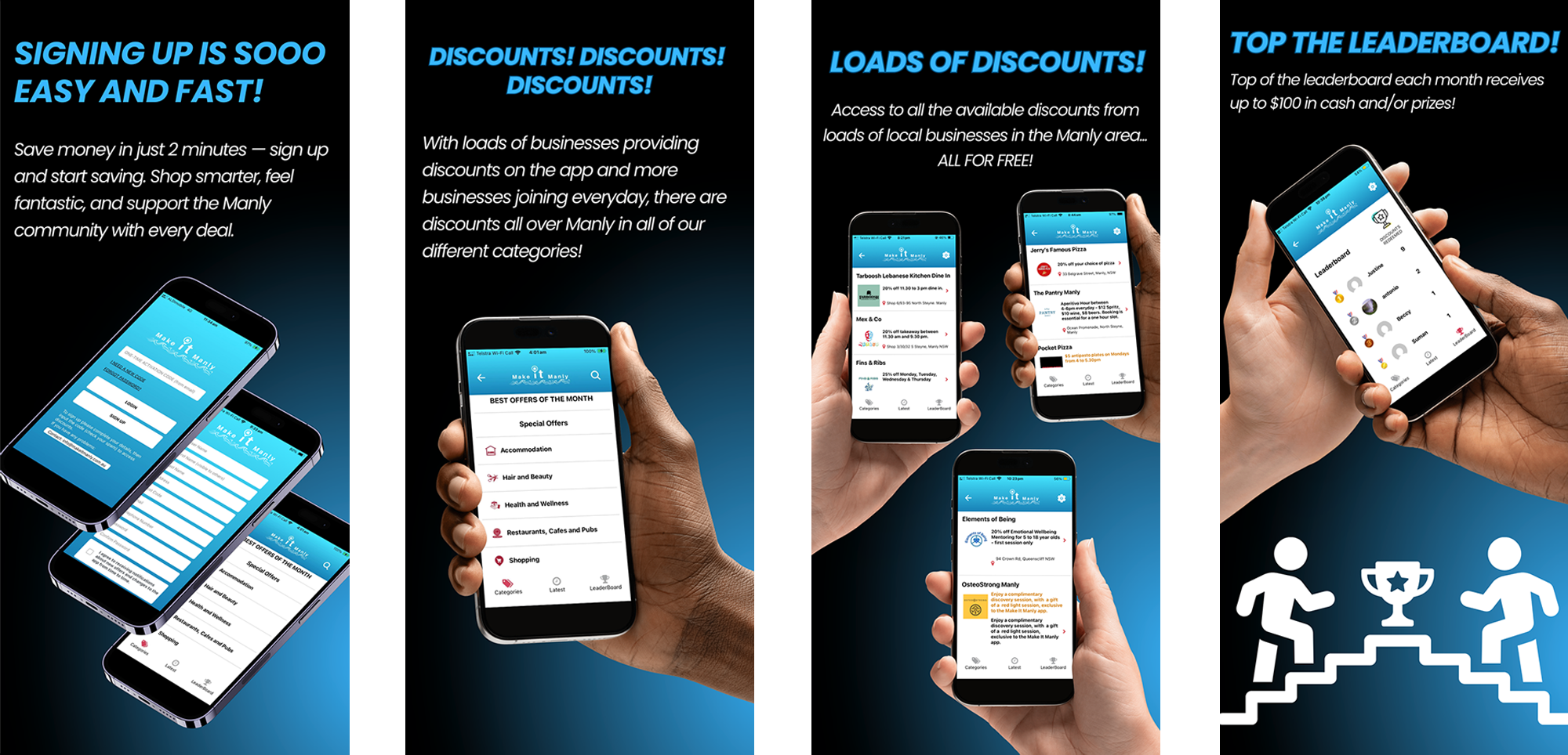 The brief was to build an app for which residents and visitors in Manly, Australia can sign up to receive discounts on shopping, eating and leisure. They can use the app to locate participating retailers and restaurants in the Manly area to redeem discounts, which are added and managed by the Make it Manly team.